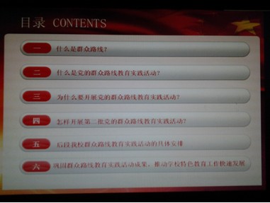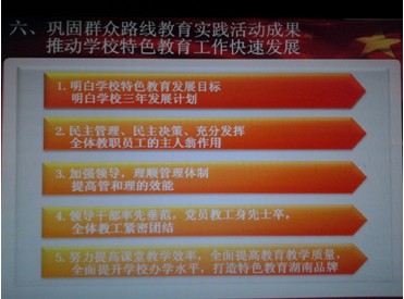 他从“什么是群众路线?”、“什么是党的群众路线教育实践活动?”、“为什么要开展党的群众路线教育实践活动?”、“怎样开展第二批党的群众路线教育实践活动?”四个方面带领全校党员再次深刻理解了开展群众路线教育实践活动的背景和意义,工作内涵和具体要求,在此基础上重点部署了后阶段学校群众路线教育实践活动的具体安排,并结合学校工作实际,就“巩固群众路线教育实践活动成果,推动学校特色教育工作快速发展”方面提出具体要求:一是要明白学校特色教育发展目标明白学校三年发展计划;二是要加强民主管理、民主决策、充分发挥全体教职员工的主人翁作用;三是要加强领导,理顺管理体制,提高管和理的效能;四是要领导干部率先垂范,党员教工身先士卒,全体教工紧密团结;五是要努力提高课堂教学效率,全面提高教育教学质量,全面提升学校办学水平,打造特色教育湖南品牌。