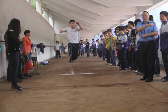 跳远安全责任人谭水生主任维持赛场上的秩序,确保安全。