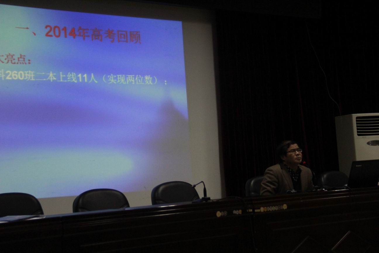 下半段由李国柱校长主持。首先,彭仁堃副校长做了一个主题为“凝神聚力,超越不断”的教学工作报告。报告非常精彩,主要由四部分组成:一、2014年高考回顾。简单介绍2014年高考情况之后,彭校长主要谈了高考成功的六点经验:1、转变了学习方式。通过从高一开始搞新课改,学生学习方式和老师教学方式转变,提高了课堂效率。2、抓实了常规教学。教务科和级部通过严抓常规教学,促进了教师的专业成长,提高了高考的复习效率。3、抓紧了学风建设。在级部和班主任的齐抓共管上,各班级的学风从3月份开始有了很大的改善。4、做好了培优补偏。5、加强了学习交流。尤其是通过与长郡中学的远程网校合作,为教师提供了更多好的学习资源,提高了高考复习的针对性和有效性。6、高考领导小组成员务实。领导小组成员深入班级一线,尤其是李国柱校长蹲点的257班,杨电波书记蹲点254班,经常与班主任和学生交流,关心学生的学习生活,关注高考,经常为老师和学生送去“温暖”,在高三的最后几个月的复习迎考中,给予了无形的力量。二、2014年学考回顾。成功经验主要归结于:1、从起始年级抓起。2、管理工作做实做细。3、学考的教学工作突出了重点,尤其是抓好了“重点学科”、“重点班级”、“重点人物”的突破。4、打造了一支过硬的教师队伍,彭校长对这支高二的教师队伍给予了高度的评价。三、结合市教科院和学校开展的两次视导,提出当前教学存在的问题:1、上课准备不充分。2、导学案变成练习案。3、素材呈现“碎片化”4、知识解析太“平面”。5、满堂灌,学生主体作用发挥不足。6、教学设计不顾学情。7、试卷讲评无学生答题记载,无知识迁移。8、对已知的重点、难点如何突破无方。9、课堂华而不实。10、课堂组织能力不足。四、关于教学的几点思考。彭校长谈了自己平时教育教学的几点感悟和思考,话虽然简单易懂,但都引人深思。1、没有爱,就没有教育。2、让学生“亲其师,信其道”还只是走好成为优秀教师的第一步。3、“名师”不一定出高徒,但“严师”带出的徒弟永远会记得其师。4、没有反思,就没有教师的专业成长。5、花在备课上的时间越长,学生学起来越轻松,老师自己今后越轻松,学生对老师的崇拜指数越高。6、湖南省“一师一优课”、“一课一名师”活动已启动。最后,彭校长寄语结束了自己的报告:今天上班了,明天还得上,这是职业。今天上班了,明天还想上,这是事业。