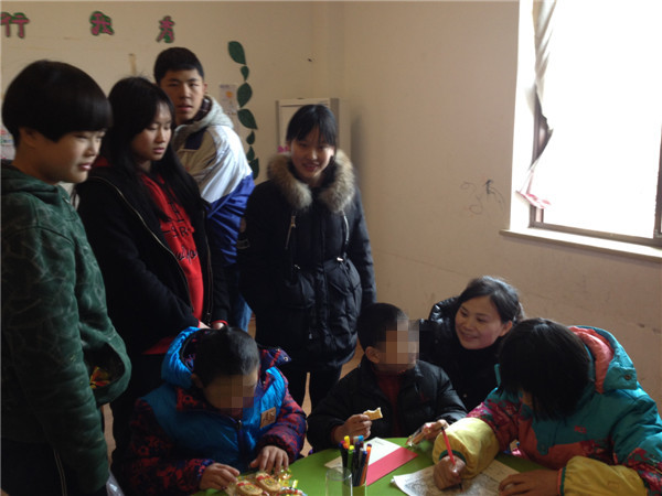 老师和学生与福利院的孩子们亲切交流
