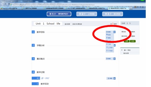 6、在“教学目标”后点击“编辑”,选“修改”,将你准备好的教学目标文字复制过来,再点击“保存”就可以了,