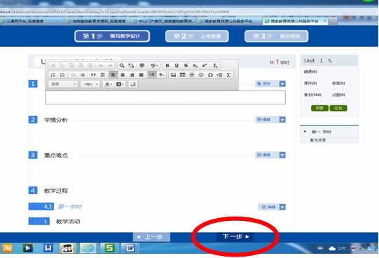 8 、接下来点“下一步”,上传课例中的课件、音频、视频、微课等资源,上传资源时计算机会提示你安装HttpUploader5.exe控件,上传完成后也要点“保存”。因为提交后不能修改了,所以全部完成才能点“提交”。