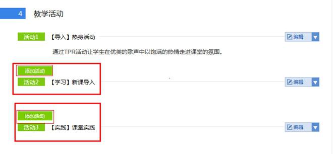 7、教学活动:点“添加活动”,可将教学过程分为导入、学习、实践、练习、课堂小结等几个活动环节。