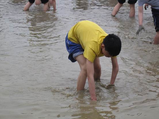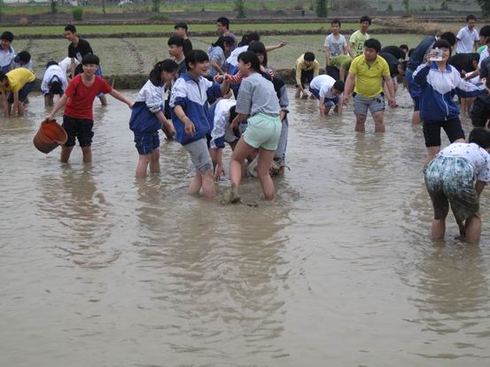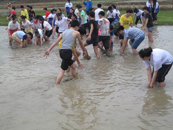 因为还在下着小雨,水很凉,首先下去的是一些男同学。他们卷起裤脚就往水田中间冲去,在他们的带领下,慢慢的下去抓鱼的同学越来越多。