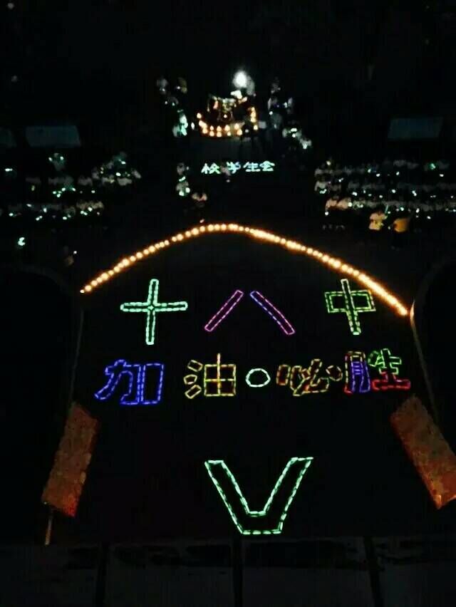 株洲市第十八中学校学生会特意选在5月20日这个特别的日子的晚自习,摆好各种荧光棒,站在楼下给高二学考、高三高考加油!整个气氛瞬间到达顶点!一方面让高一的学生感受到了高考、学考的压力,另一方面让高二、高三的学生受到了鼓舞与激励,让三个年级的学生产生了良好的互动,给高三即将毕业的学生留学了难以磨灭的人生回忆。