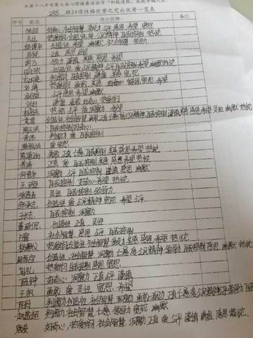 每个班级形式不一,风格各异。284班的同学们主动走上讲台,结合学考难点突破,谈如何积极进取。教室气氛非常轻松,活泼,同学们“意气风发”、铿锵有力的发言引来阵阵喝彩,班主任刘雪枚老师喜笑颜开,赞叹着同学们乐观的态度,良好的心态。282班易洁老师带头分享了积极进取的故事,接着各组同学进行了分享。288班阳光心灵使者言达制作了班级同学24项性格优势表,同学们相互交流如何加强突出优势。287班阳光心灵使者楚汶泽担任主持,提前写好主持词,一位女生还准备了一篇励志英语演讲。