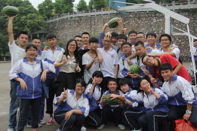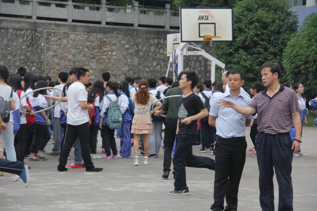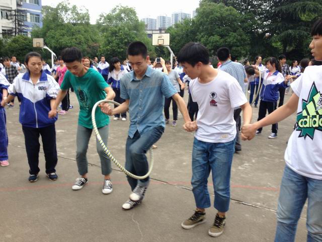 5月29日下午,高二年级在田径场热闹的开展“无敌风火轮”竞赛。在校篮球场,高三年级的孩子们正非常起劲的玩着心理减压拓展游戏。高三级部长文新岳老师亲自指挥,副级部长杨飞雪老师带领级部老师负责组织,各班班主任带队,“珠行万里”、“成功穿越”、“小火车赛”三个小游戏相继开赛。