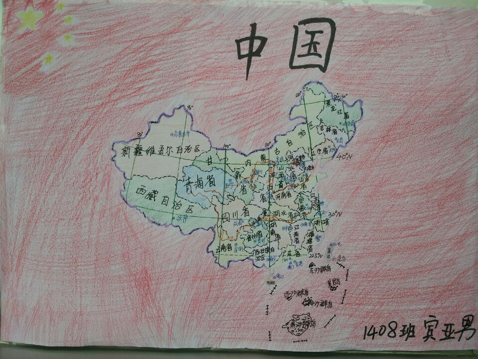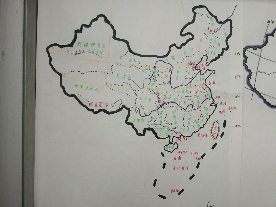 地图是地理的语言。高一年级备课组为丰富学生的课余文化生活,学以致用地举行了“中国地图”绘制比赛。虽然各位同学都是初次接触地图绘制,但是其水平不亚于专业的绘制。同学们凭借着自己对祖国的认识绘制出了一幅幅个性化的地图,其中不乏有比例精确、精美绝伦的、内涵丰富的、风趣幽默的地图。