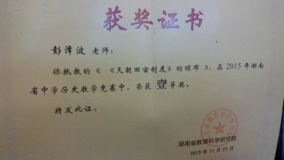 我校彭泽波老师在获得2015年株洲市中学历史课堂教学一等奖后,代表株洲市参加11月27日在怀化举办的湖南省中学历史课堂教学竞赛。