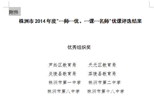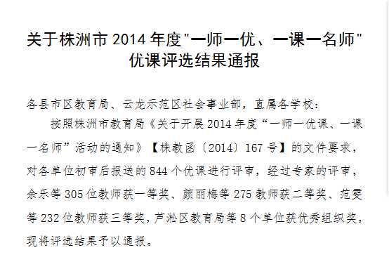 在我校全体老师的共同努力下,我校在株洲市2015年度"一师一优、一课一名师"活动中取得了可喜的成绩,我校荣获株洲市2015年度"一师一优、一课一名师"优秀组织奖。老师们的优课也取得了很好的成绩。获奖名单如下: