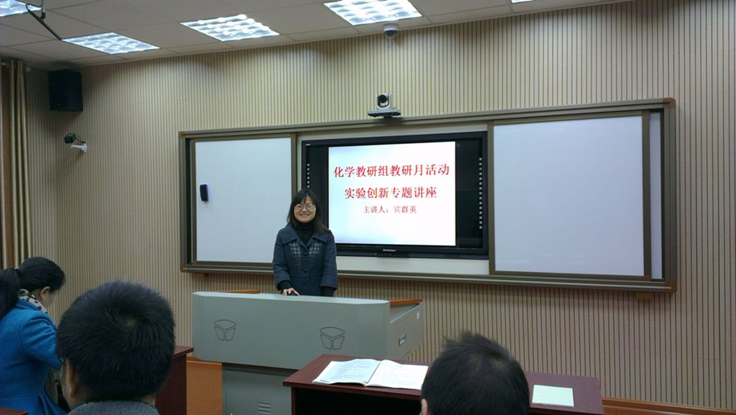 教师专业成长永远在路上,为促进教师专业素养,提高课堂效率,配合学校的“教科研活动月”活动,化学教研组于2015年12月3号上午,在学校录播教室举行了题为《化学实验创新》的专题讲座,主讲人为宾群英老师。宾群英老师今年参加了在长沙举行的湖南省实验创新大赛以及在厦门举行的全国实验创新大赛,她与大家分享了她的所见,所闻,所想以及所得,让大家看到了高水平的实验创新,组内还进行了积极的交流,讨论,收获很多。