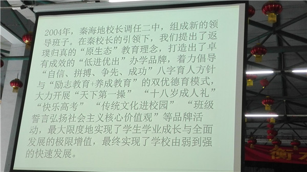 我们到达衡水二中已是下午,没有实地目睹跑操,首先自由参观学校文化,然后听了学校领导崔广义老师“脚踏实地,自强不息铸名校 仰望星空,倾尽丹心育英才”的报告。再分别听了一节语文数学公开课。后结束衡水二中的参观学习。