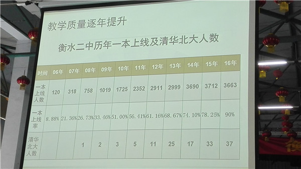 衡水二中创建于1996年,其前身是衡水市职业高中,学校一直处于快要办不下去的状态,直到2004年,学校领导班子调整,以秦海地校长为首的领导班子带领二中人锐意开拓、求实创新,独创“原生态教育理念”,弘彰“低进优出”办学品牌,几年时间便实现了迅速跨越崛起,打造成了全国知名学校。
