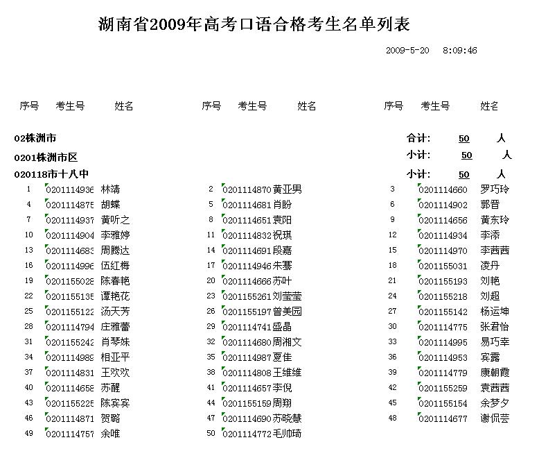 湖南省2009年高考口语合格考生名单列表