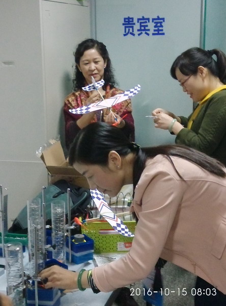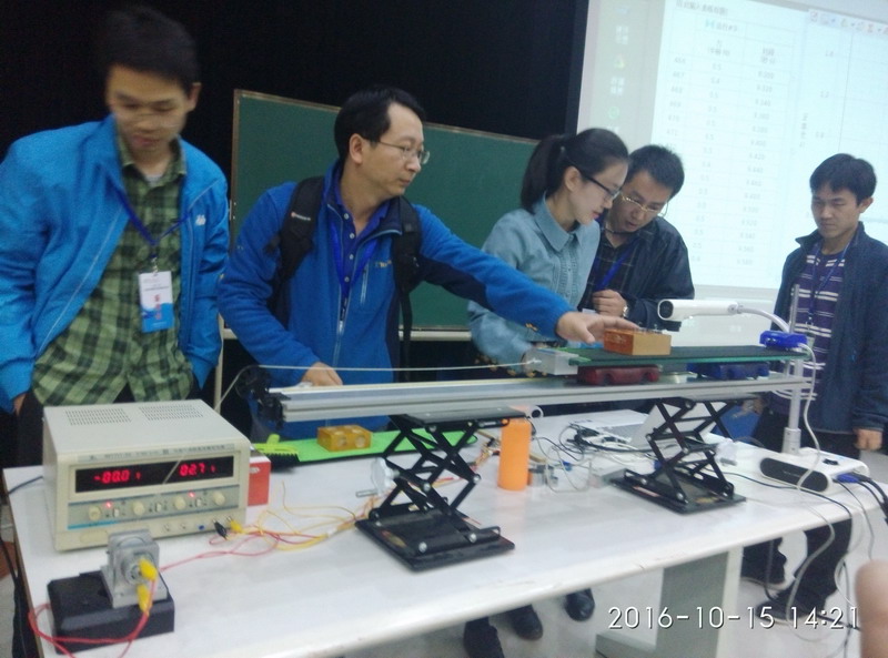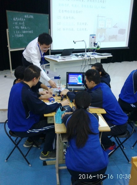 北京柳老师:指导学生用力传感器和位移传感器作为测量工具探究弹簧弹力与弹簧形变量关系。关于传感技术要不要进课堂,老师们也有争论,觉得用简单手段就可以解决的为什么还用传感器,还不够给学生培训技术花时间。我自己的观点是在技术日新月异发展的今天,我们要拥抱技术,让它为我们服务。在天时地利人和的条件下,柳老师展示了传感器与课堂教学的结合,引起全国各地来观摩的老师们的高度关注。