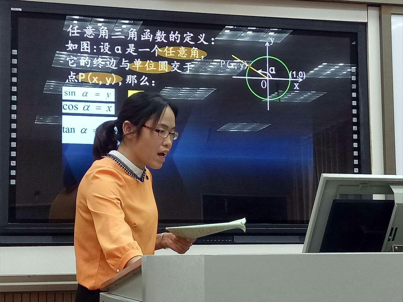 杨宇老师参加的是"株洲市高中数学核心概念教学设计比赛".数学核心概念是一个拥有“核”的“概念群”,是由核心概念及其生长出的子概念组成的知识体系。而参赛教师必须植根于某一数学核心概念进行教学设计制作出微课视频。微课视频必须符合概念课教学的一般规律,诸如为概念学习创设恰当的情境、揭示概念的本质以使学生更好地形成与获得概念、对概念进行辨析和变式训练、概念的准确运用等。杨老师就其选定的"任意角的三角函数"这一核心概念,从学生熟悉的摩天轮入题开始对这一概念的探究.最终她获得了市二等奖的好成绩.