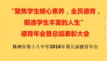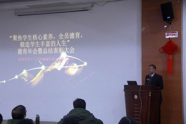 2017年元月14、15号两天,株洲市十八中全体德育工作者以及全校校级领导、中层干部,在杨电波校长、彭仁堃书记的关怀指导下,在环境优美的长沙千龙湖畔召开了第九届德育年会“聚焦学生核心素养,全员德育,锻造学生丰富的人生”2016年德育年会暨总结表彰大会。