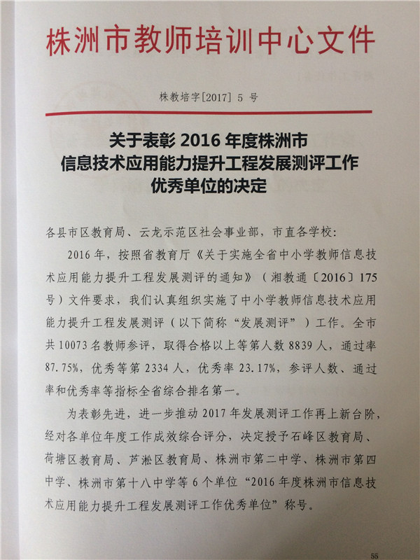 我校与会的有党委书记、主管教学的副校长彭仁堃,教师发展中心主任赵宏俊,名师工作主持人刘立红,国培辅导教师彭方晴。我校获得“2016年度株洲市信息技术应用能力提升工程发展测评工作优秀单位”称号。刘丽红老师获得“优秀辅导老师”称号。教师发展中心茹建雄老师获得“教师发展导报”通迅员二等奖。