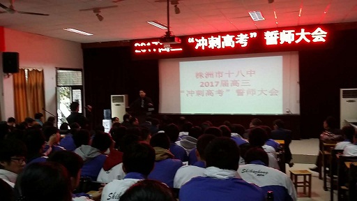 3月10日下午,春风骀荡,春意融融。十八中学校领导、高三级部全体师生齐聚于学校阶梯教室,隆重召开2017届高三高考冲刺誓师大会。会议由级部江孝平副部长主持。