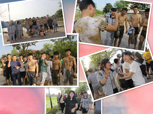 开营仪式后,全体同学回农户家安顿好行李,换好衣服,相继赶到鱼塘边抓鱼啦!男生脱下上衣,长裤,猛地跳下水,女生卷起裤腿,挽起衣袖,小心翼翼的紧随后面。抓到鱼的欢呼声一片接一片,越来越多的同学按捺不住,加入了抓鱼大军,老师们也跳入水中,和同学们一起抓鱼。有的单独作战,居然也可以一抓一个准,据说,1609班一位男生抓了近20条,更多是集体围剿,或者排成一排扫荡,或者围成一个圆圈;还有的同学在池塘远端玩起了泥巴仗,在泥地里翻滚嬉戏,High翻天!这是一个快乐的下午。岸上围观也是乐趣多多。