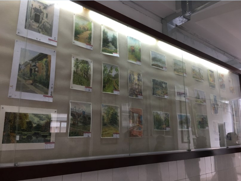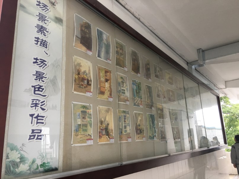 教学楼二楼至六楼的橱窗展示了2017届专业生及2018届专业生的优秀作品。作品内容涵盖:“向大师学习”“杭州集训人体、风景、人物肖像优秀作业”、“场景素描、场景色彩”、“2017届毕业优秀作品选集”四大主题。5个橱窗的布置皆由现高三专业教师整理布展。以袁旭老师、林子老师为首的高三团队8月28日才从长沙集训归来,29日便投入了紧张的选画布展阶段,9月2日便使橱窗焕然一新,用最高的效率完成了工作。