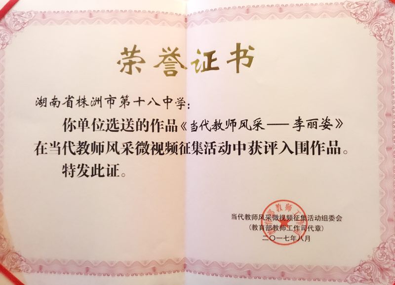 2017年5—8月,教育部教师工作司联合中国教育电视台、中国教师发展基金会、北京电教馆,面向全社会开展了“当代教师风采”微视频征集活动。经技术筛选、专家初审、专家终审,株洲市第十八中学李丽姿老师的微视频作品《当代教师风采从来自全国的5100件作品中脱颖而出,挺入全国前80强,成为湖南省仅有的两名老师中的一位。