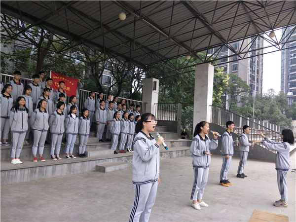 气势磅礴,深情款款,四名学子领唱,1706全班伴唱,《歌唱祖国》在市十八中上空嘹亮响彻、回旋,全体十八中人庄严肃立,举目仰望,五星红旗迎风飘扬。