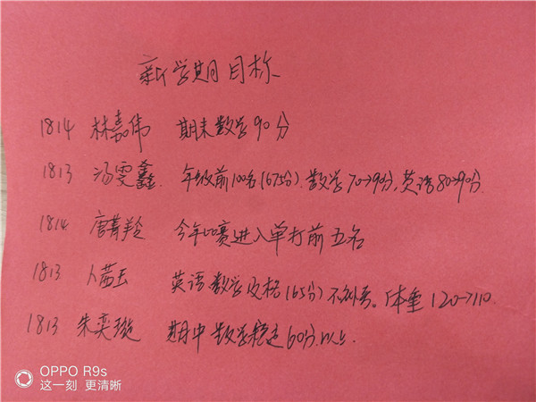 据悉,新学期第一节心理课主题是《新学期,新愿景》,心理老师带领同学们学习运用smart原则来分析目标,有时候不是毅力问题,而是目标本身出现了问题,如“考出好成绩”,需要更清晰化,具体化,可衡量,可达到,与核心目标相关,并且设置一个时间期限。有同学调整了自己的目标:我要在期末将数学由70多分提高到90分。“我在6月末将百米跑提高到14s”。