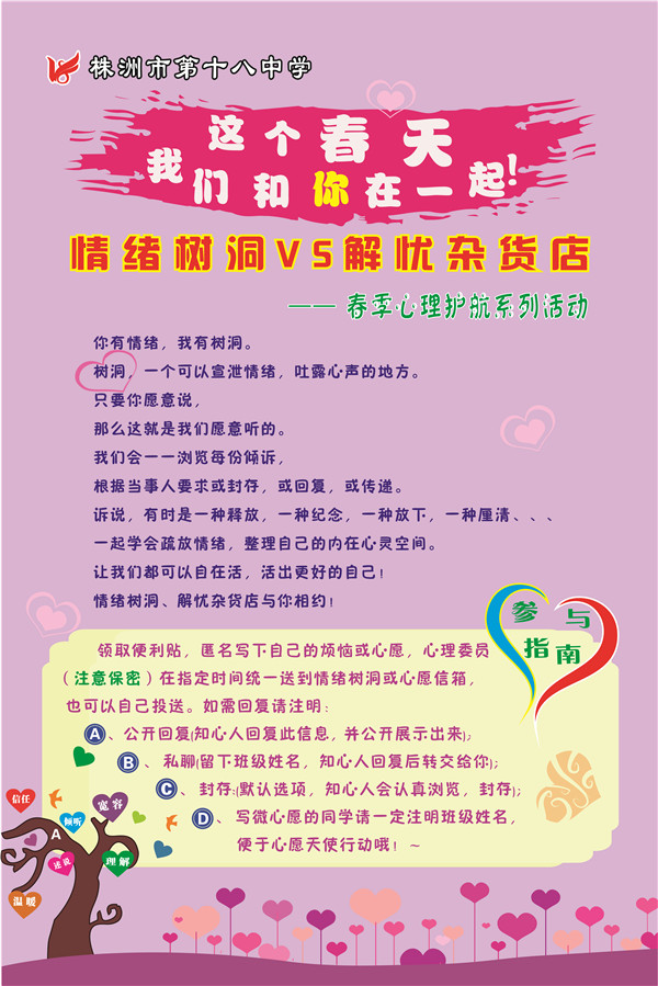 春季是四时之首,春天天气变化快而无常,且多阴雨天气,这容易使人的情绪发生波动,让人感觉压抑,导致心理问题甚至心理疾病的产生。为了帮助师生释放内心的压抑,感受集体的温暖,丰富业余生活,市十八中拟开展以“春风相随,温暖相伴”为主题的心理护航活动。