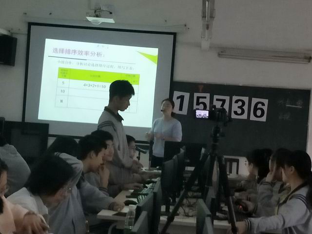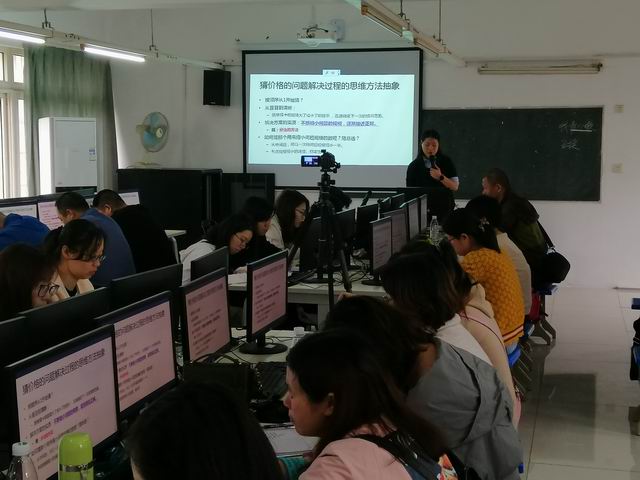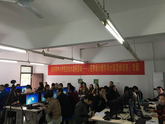2019年4月19日,株洲市所有高中信息技术教师齐聚株洲市第十八中学,参加信息技术教研活动。不到八点,各个学校的老师就早早地来到了我们十八中实验楼的机房,首先是株洲市十八中的汤丽峰老师在高一1811班上了《选择排序法》这一研讨课,汤老师把抽象的、枯燥的算法课上得生动,有趣,用各种教学方法化难为易,深深吸引了学生的兴趣。得到了所有老师的一致好评。课后老师们分组交流、讨论,还结合这节课,就编程教学中存在的困难或问题展开评课与研讨,各个小组组长集中总结了本组的研讨结果,教研员谢良军老师对研讨结果作了总结、评价。谢老师还作了《计算思维之抽象》的讲座,为老师们以后的教学实践进一步明确了方向。南方中学的信息技术学科带头人薛琛老师作了《怎样在算法与程序教学中培养计算思维》的讲座,薛琛老师以两个算法课例的设计为例剖析了怎样培养学生的计算思维,她把教学中积累的丰富的教学经验毫无保留地传给大家。培养和提升学生的信息技术应用能力的重要途径之一是信息技术课程教学,计算思维作为信息技术的一项普使技能,为学生信息技术课程学习奠定了基础,对学生信息技术能力的长远发展具有广泛而深远的影响。株洲市全体信息老师,将再接再励,以饱满的热情,不断学习,为学生的成长、教师的专业提升和学校的教育现代化发展做出更大的贡献。