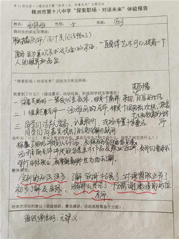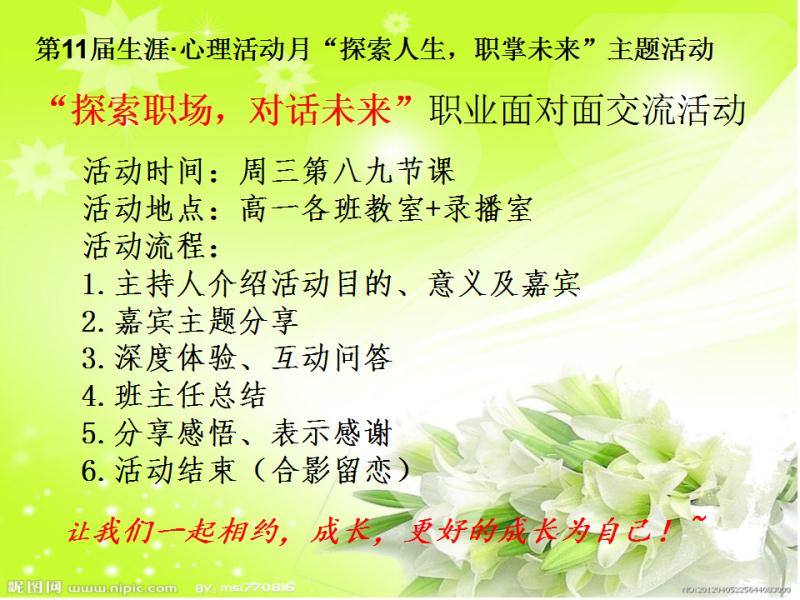 每个嘉宾都做了非常精心的准备,制作PPT,拍摄工作相关影音资料,提炼智慧,这份用心感染着每一个听讲的人。“很多都是书本上学不到的东西”“近距离接触了职场专业人士,加强了对这个行业的了解”、“关于未来,我看得更清晰了,减少了迷茫!”、“增强了学习动力,找到了目标和方向”,学生反馈收获多多,热烈期盼着类似的活动能多开展。“学校开展这样的活动非常有意义,感谢学校为孩子们的成长精心谋划、务实组织”,家长们也纷纷点赞。