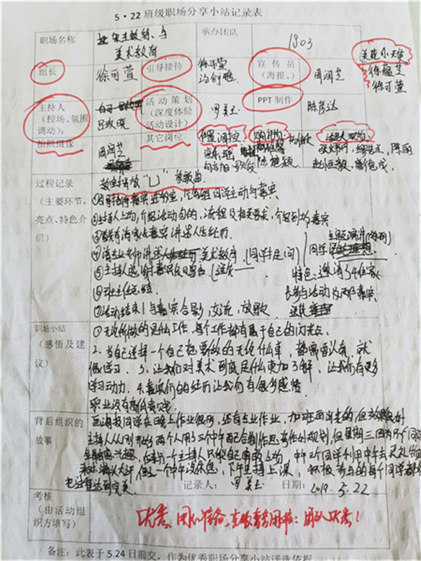 此次“探索职场,对话未来”活动由学生工作发展中心和高一级部联合策划组织。高一各班班主任充分发挥家长委员会的力量,发出通知,征集报名。不少嘉宾主动报名,提前准备演讲PPT。各班组建了职场分享小站,班长担任负责人,其他同学献计献策、各展其能,有的担任策划人,负责环节设计、促进深度体验;有的担任宣传员,负责海报、拍照摄像,还有服务组、接待组、PPT制作组等等。学生的才情和创意被无限激发。一位班主任介绍说,给嘉宾的鲜花、礼物都是孩子们自己想的。