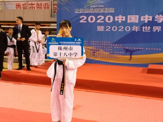 在2020年中国中学生跆拳道联赛(南部赛区)暨2020年世界中学生运动会跆拳道项目选拔赛中,株洲市十八中高二1909班余紫爔同学喜获女子55Kg组金牌。全国中学生跆拳道联赛