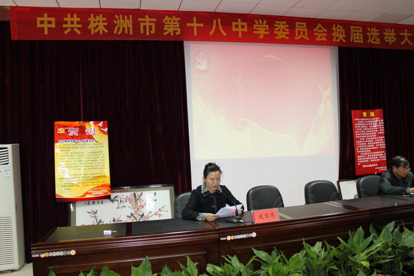 2010年10月29日下午,株洲市第十八中学第二届党委委员选举大会在学校多媒体报告厅隆重举行。会议由学校党委委员、副校长彭仁堃同志主持,市教育局党委委员胡祥和同志、政工科科长刘迎久同志莅临指导,兄弟单位领导、全体在职以及退休党员、民主党派代表参加会议。