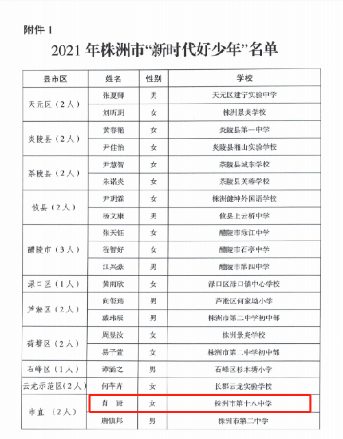 十八中:热烈祝贺我校肖婕同学荣获“株洲市新时代好少年”称号