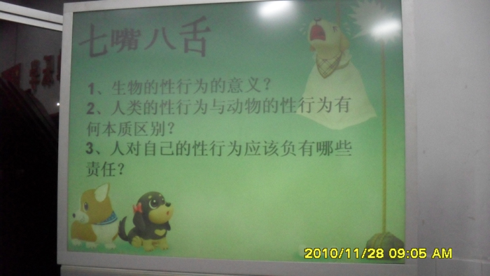 《性的认识》一课是教育部课题《系列中小学健康教育教师教学指导用书》高二第六课的课题,该课题的教学任务由孙金花老师和周志雄老师承担,由于课题内容的特殊性,建议男生和女生分开授课,所以12月6日利用晚自习时间两位老师分别在高二225班和231班分男生和女生进行了授课。该课的教学目标:一是能解释“性”的含义,说明“性”与“性行为”的区别与关系,二是认同性道德对维系良好社会环境中的作用,并能运用性道德观辨别不健康的性行为,三是让学生初步确立平等的、非歧视的、自主负责任的性观念,形成良好的性健康行为和积极健全的人格规范。教学内容包括性的解读、性行为与性道德、性卫生保健与性行为规范。该课的教学受到学生欢迎。课堂教学气氛也很热烈,由刚开始的不敢谈,不好意思谈,到后来畅所欲言,学生也说出了自己对性认识的疑惑,对性的不正确的看法和态度,提到如何进行性的自我保护时几乎所有同学都发了言。收到良好的教学效果。以下是课堂教学的一些片段。