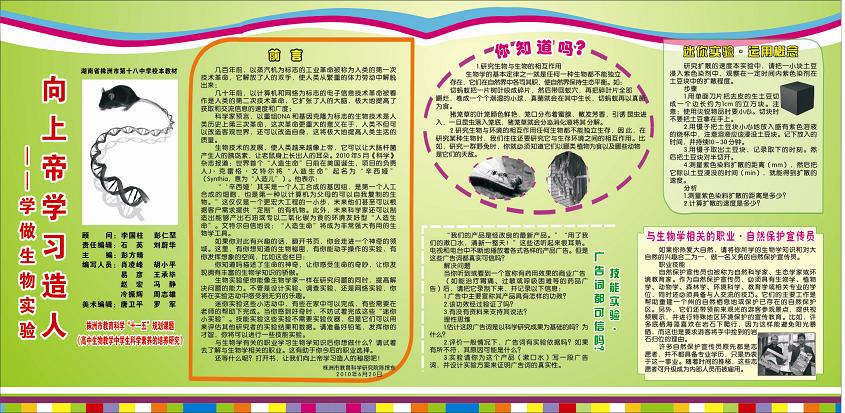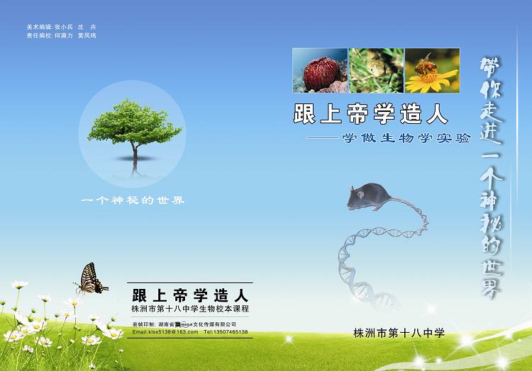 《向上帝学习造人――学做生物实验》校本教材是十八中市级课题《高中生物教学中学生科学素养的培养研究》的研究成果之一,该教材由株洲市教育科学研究院陈捍东副院长命名并作序,彭方晴老师主编,生物教师王承毕、易彦、肖凌峰、胡小平、赵宏、冯静、周志雄和冷振辉老师参与了编写,美术编辑是唐卫平和罗军老师。