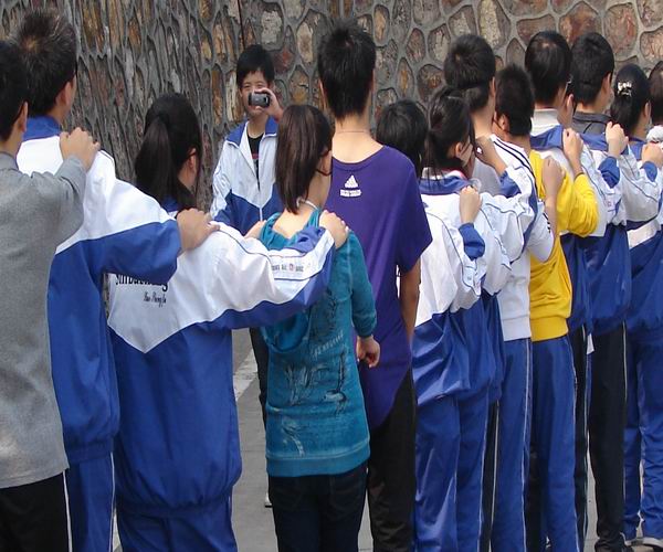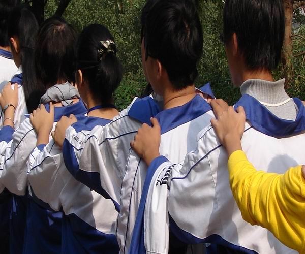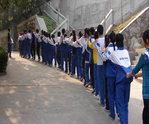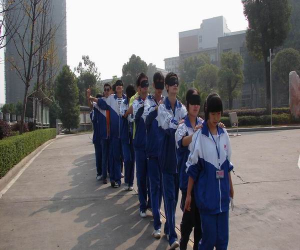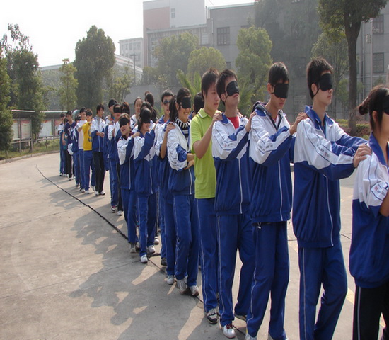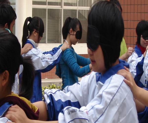 在冬日灿烂的阳光下,学生们一个接一个,双手搭在前面同学的肩膀上,组成一条长龙,在校园徐徐行走。他们头戴眼罩,有的焦急紧张,有的面带微笑,有的小心翼翼,有的闲庭漫步。。。走近一问,原来是同学们正在体验一堂心理课“盲人旅途”。