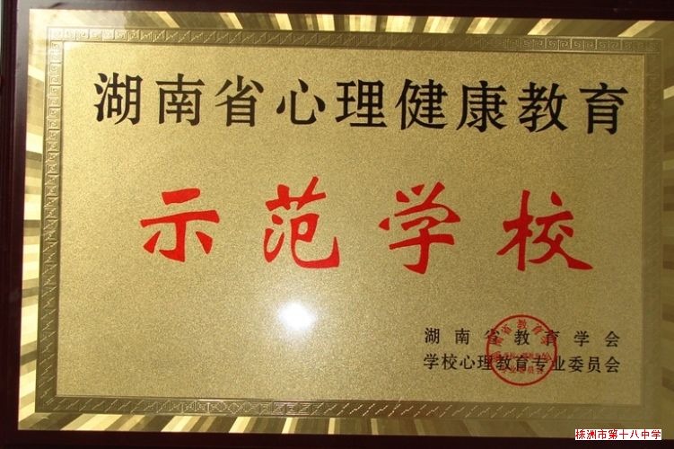 在湖南省心理健康教育学术报告暨表彰大会上,株洲市十八中学被湖南省教育学会学校心理健康教育委员会评为“湖南省心理健康教育示范学校”,这是我校继连续三年荣获“湖南省学校心理健康教育先进单位”之后,在心理健康教育方面获得的又一殊荣!特向全校师生报喜!