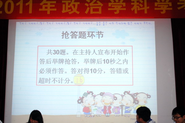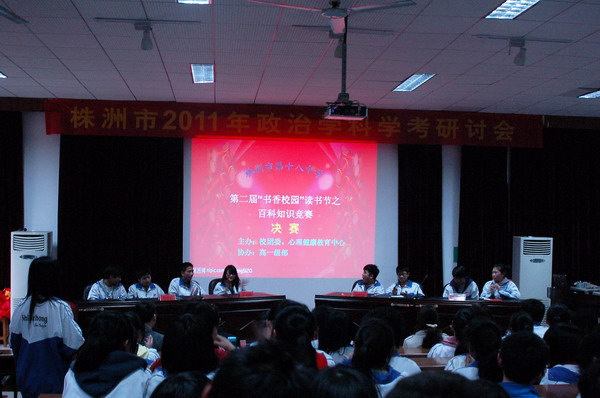 2011年4月13日下午,我校阶梯教室掌声雷动、气氛热烈,由校团委、校心理健康教育中心主办,高一级部协办的第二届“书香校园”读书节之百科知识竞赛决赛在这里举行。本次竞赛初赛在本月8号进行,初赛共选出了237、238、240、246四个优胜班级参加决赛。