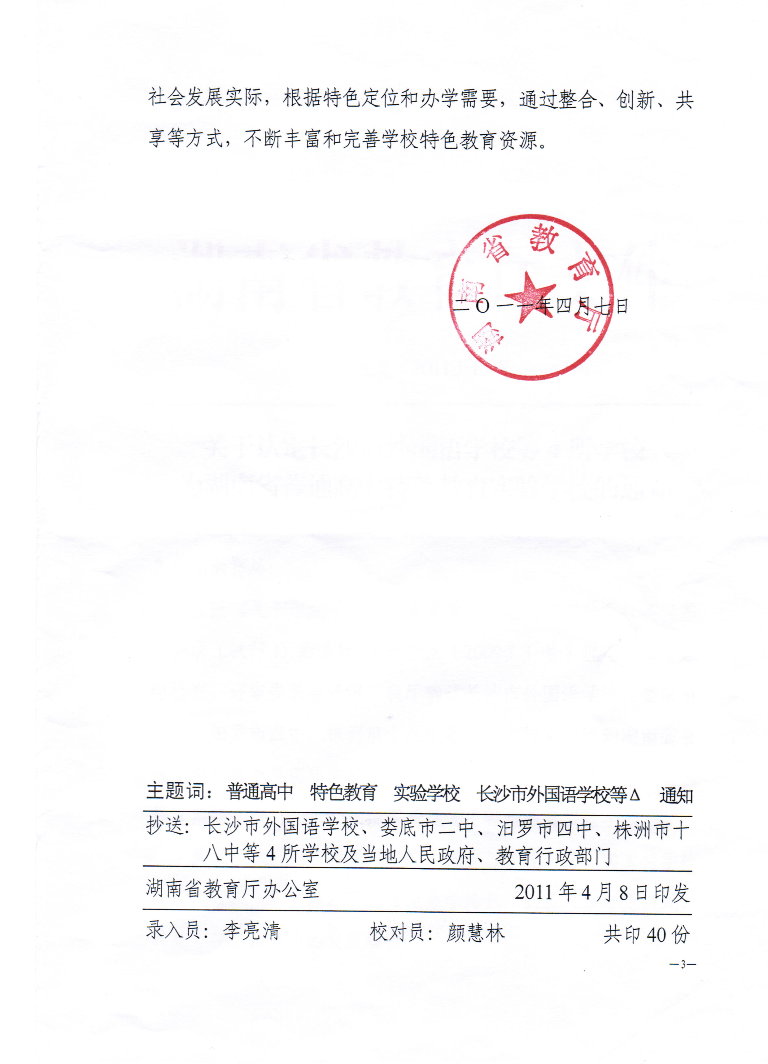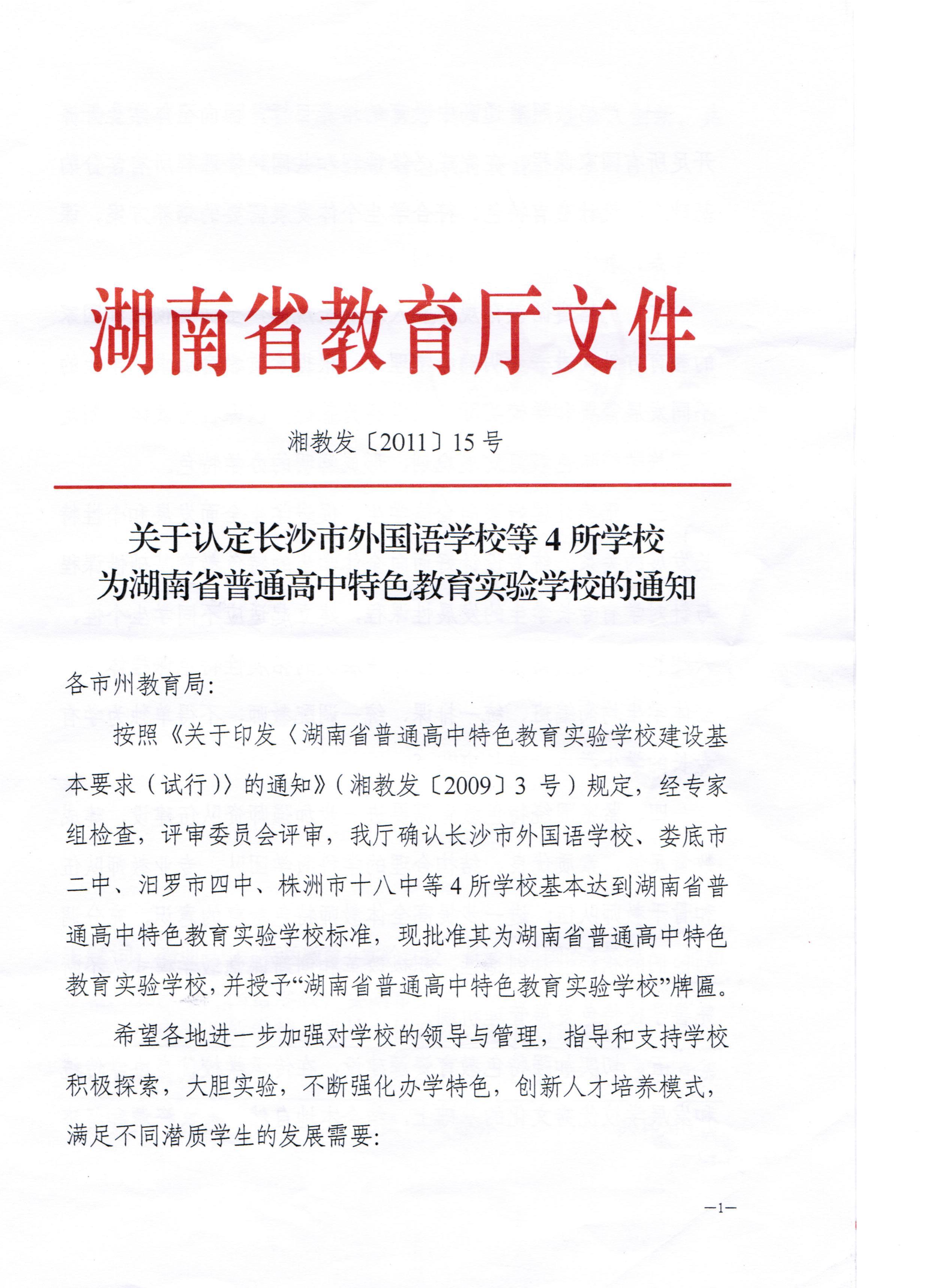 热烈祝贺我校被湖南省教育厅认定为湖南省普通高中特色实验学校