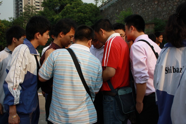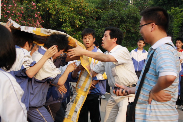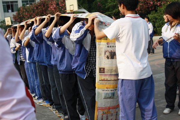 在赛场上,经过高二级部部长、班主任的精心指点,学生骨干的认真组织,整个比赛有秩序的进行着。在比赛的过程中,竞赛团队在领队的带领下,喊着1、2、1、2的号子,沉着应战,协调前进;啦啦队面红耳赤,呐喊助威。后勤组递茶送水,秩序井然,整个赛场群情激昂!