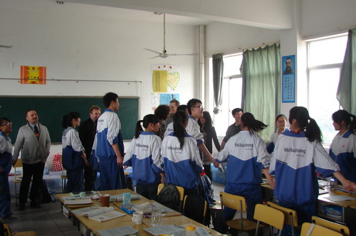 第一节课,威尔士大学教授们听取了倪秀丽老师组织高二228班学生开展的关于"The Olympic Games"话题的一堂课。这堂课设计环节新颖,流程紧凑。在倪老师的带领下,课堂上掀起了一个又一个高潮,其中包括学生充当小记者现场采访威尔士大学教授们。最为精彩的莫过于学生邀请威尔士大学教授们一起唱"hand in hand"这首歌。手挽手,忘记了国籍,忘记了师生,只有一个梦想"hand in hand we are together",课后教授们都不禁竖起大拇指夸我们的学生大方,可爱。第二节课,大家听取田玉娇老师的一堂关于"environment"话题的课,融洽的课堂氛围和孩子们精彩的表现给客人及老师们留下了难忘印象。