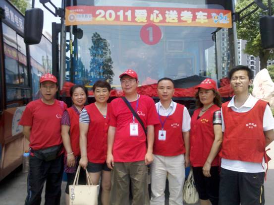 在高考期间,市公交公司、晚报义工为十八中全程送考献爱心。
