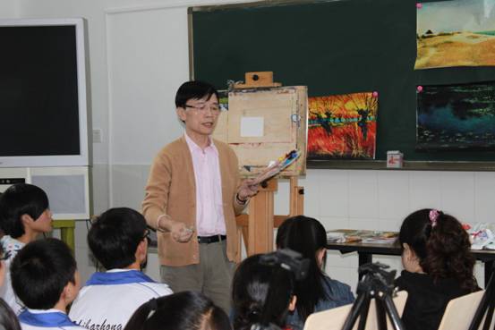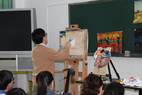 李老师选美术基地五模块(油画、陶艺、创意、书法、国画)中的油画作为传教展示内容,这也是李老师最为擅长的,整节课都给人亲切而厚重的感觉,风趣幽默,形象生动,从撕报纸到用油画刀,从揩拭调色板到挤颜料,从调色到着色,从线条到色彩,从色调到主色,从实摩到虚写,从画里到画外,无不透漏他儒雅的风范和驾轻就熟的手法以及厚积薄发的英姿,他极注重细节,注重美感,更注重人生品德和品位,也许这就是一个从事艺术的人本有的天真!举手投足,举重若轻,总能给人启示,一笑一颦,手足挥洒间总给人知识。听课的学生全身灌注,听课的人也熏陶其中,在他边讲边画边示范中,一幅浓墨重彩的风景画便潇洒完成。这是一堂高雅艺术走进普通课堂的典例,美术基地十八中就是按这种模式对学生进行美的熏陶,提高审美,让每一位学生都带着切合自身的特色走出校门,带着健全的人格走进社会,当这种塔基得到夯实后,那些塔尖肯定会直插云霄。