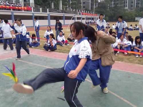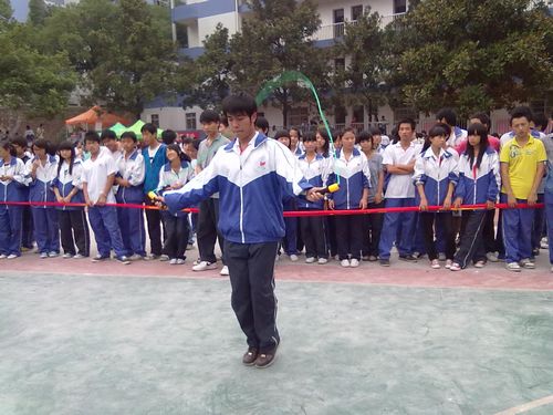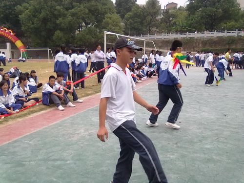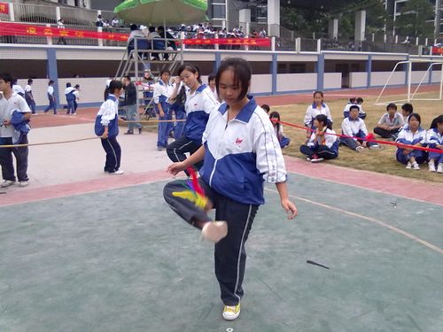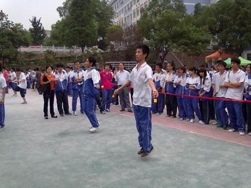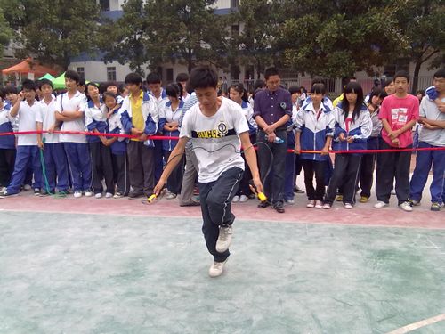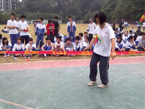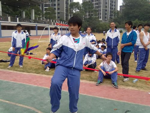 昨天下午校运会运动场上进行了跳短绳、踢毽子比赛。每班男女各四人,分年级班级进行,最后结果是:跳短绳男生245班彭子洲以一分钟217个居第一位,女生是248班周星星,183个;踢毽子男生是249班于浩男以两分钟161个取胜,女生是241班易莹,143个。以下图片是跳短绳、踢毽子比赛片段。