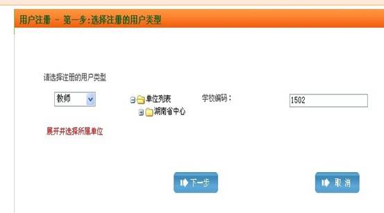 用户类型为教师,所属单位的选择请大家注意,点击湖南省中心边上的“+”,一级一级的打开,一定要选十八中,选号后,在学校编码栏中会出现1502的代码: