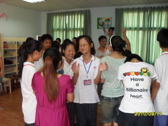 风雨同行中,2个盲人,2个无手人,1个无腿人,1个哑巴一起走过一段有障碍物的旅程,让师生感受很深。“通过这个游戏,我明白了身为一个四肢健全的人的幸福”;“每个人其实都有不完美、不健全的一面,即所谓的长处与短处。人与人之间不正需要彼此的关心、照顾与协助吗?我们不仅需要独立与竞争,更需要依赖与合作”;“我更加深刻的体会到了团结合作的力量”-----。