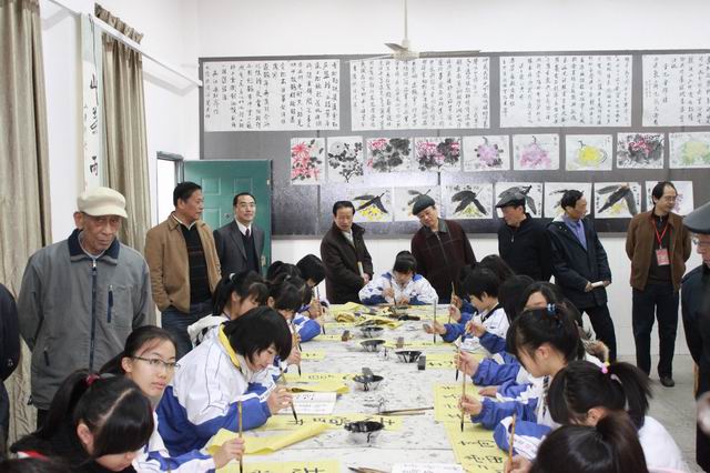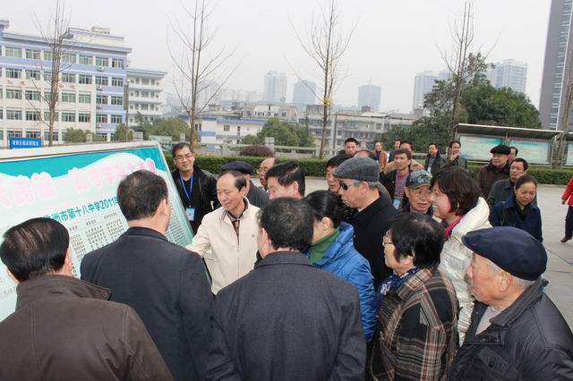 进入校门,观看学校的宣传栏,对那些优秀的老师和学生赞叹有加,特别感兴趣的是学校今年高考学考的胜利,对入校有E等的学生考上二本,对入校有D等的学生文化上重本赞不绝口,认为十八中的教育有方法有效果,低进高出这是一种学校真枪实干的水平。接着参观了学校美术展厅,在展厅里,个个喜形于色,仔细欣赏每一幅作品,老领导们如是说:“真不愧为美术特色学校”,“学生能有这样的水平,不简单”,“株洲教育有这么多优秀的教师,发展有潜力”,“这样富丽堂皇的大气展厅,这是株洲教育的一个盛典”……,接着参观学校新建运动场和文化园,一致认为这是低投入高效果的好建筑,最后参观了学校油画室、陶艺室、创意室、书法室、国画室、阅览室。“一个学校就是要能办出这样的特色”,“这条路选得好,路会越走越宽”,“学生在这里学习真是幸福的”,“株洲对教育的投入真的不少”“株洲教育在诚心实意的办学”……在参观中,老领导不时的询问教育局钟燕局长毛大训书记一些关于十八中的发展问题和株洲教育的问题,言辞切切,气氛和乐!