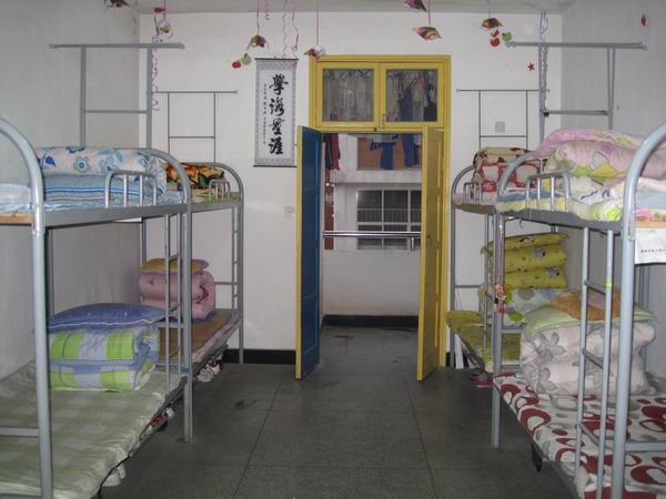 不少宿舍通向阳台的门装上了门帘。一排两排彩色透明,风铃绸缎,随风飘荡。床,被褥整齐。布娃娃,小熊,大狗歪着脑袋斜着眼地看着进门的每一个人。床沿挂着、贴着真真假假的绿叶,蜿蜒、盘旋,似乎正牵连着一片小小的绿色天地,引人遐想。